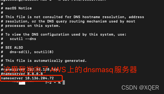 原因很简单,nslookup是用来查询DNS记录的,他是一个程序的名字,他只会来找这个配置文件。当我注释掉,并且在dnsmasq指定了解析文件的路径,那么nslookup就会去找我指定的配置文件,从而达到将所有*.dashayu.xyz的查询全部指定到AWS Route53的权威服务器的目的